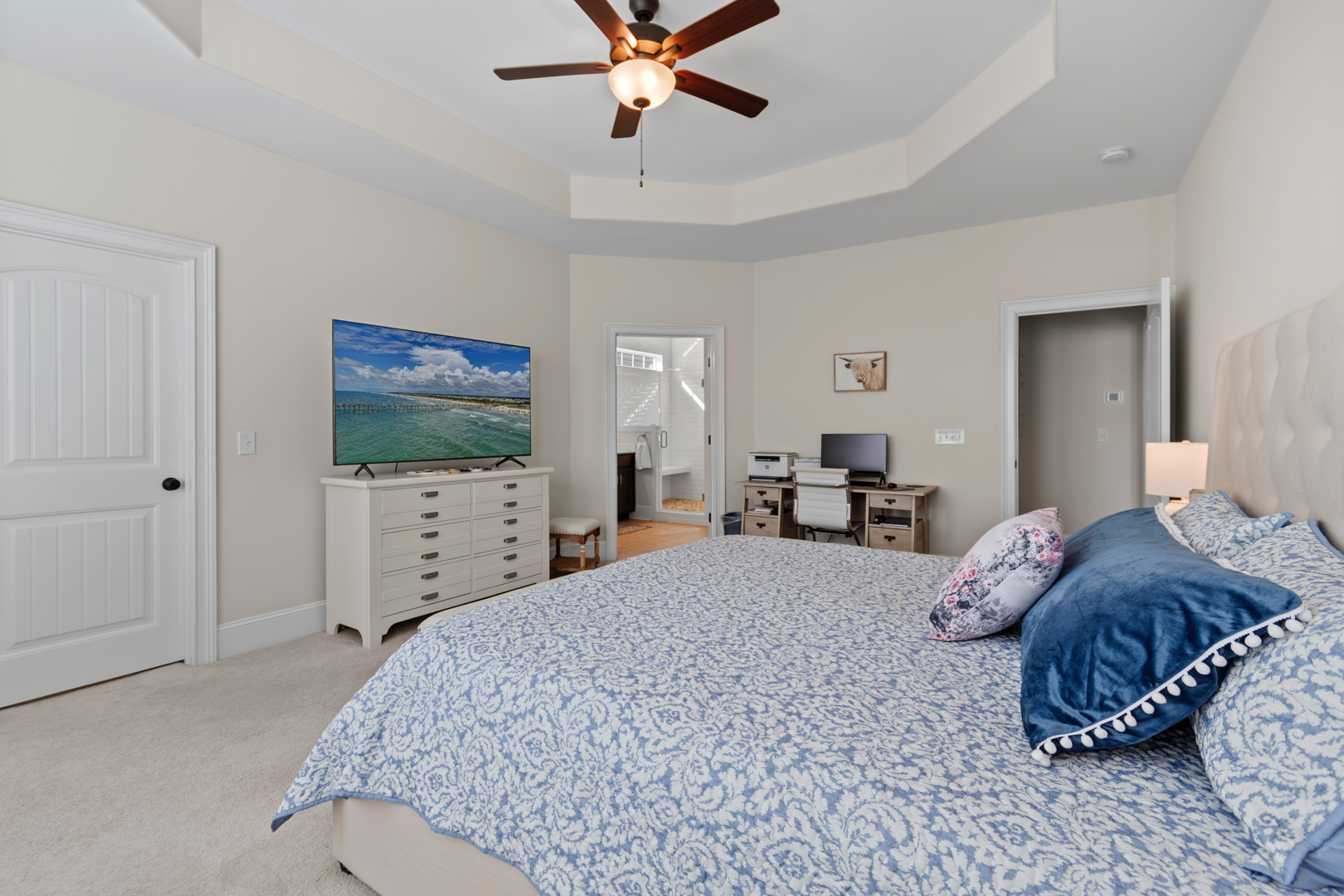The master bathroom has also been nicely upgraded with a huge walk-in, tiled shower with frameless glass doors. The spacious master closet has been upfitted with wood shelving as well. The split floor plan is quite popular, enabling homeowners and guests to have their own space. There is even a pocket door separating the guest bedroom area from the rest of the home. No details have been left out, including custom blinds on the sliders, plantation shutters in the bedrooms, double crown molding, tray ceilings, tiled accents in the guest shower, and wainscoting in the entry and dining areas. This location could not be any better. You are literally right between the beaches of Ocean Isle Beach and Sunset Beach, neither more than 8 minutes away.